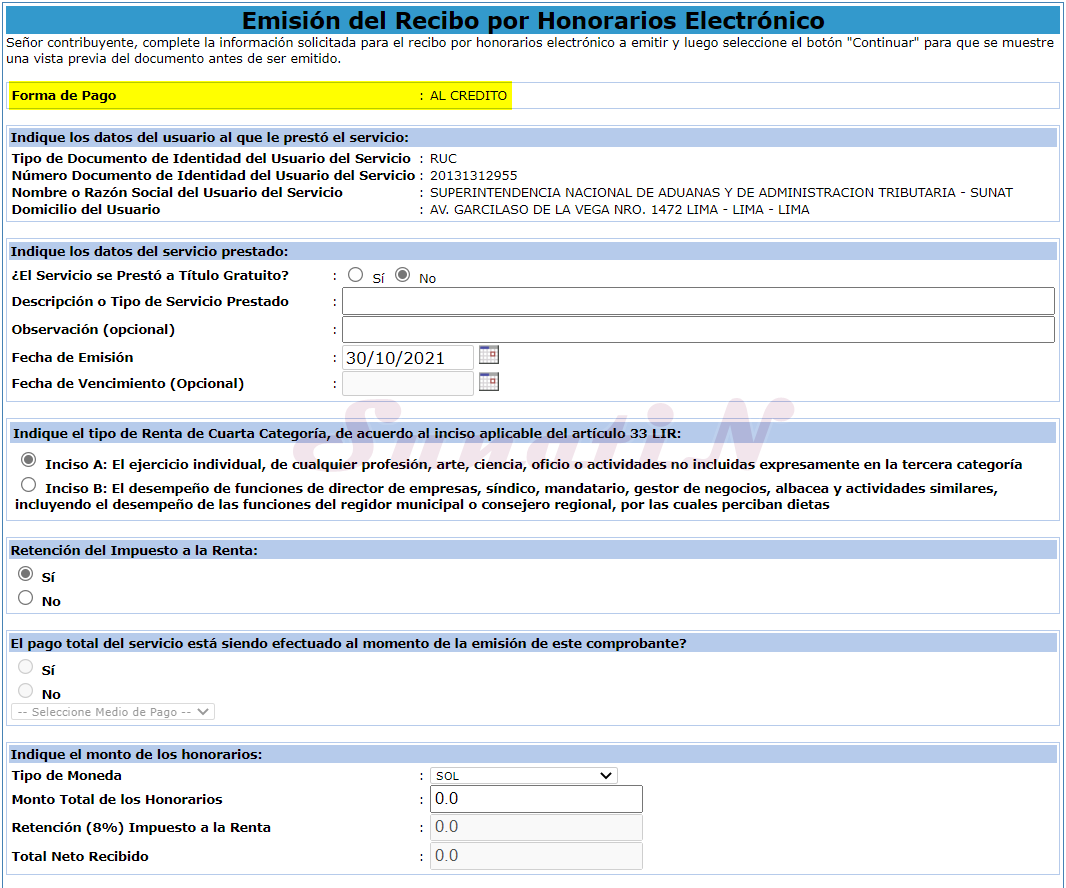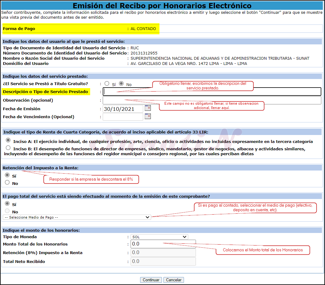 - Aquí debemos llenar la información del servicio prestado, nos guiamos por cada sección y en orden. {SunatiN}