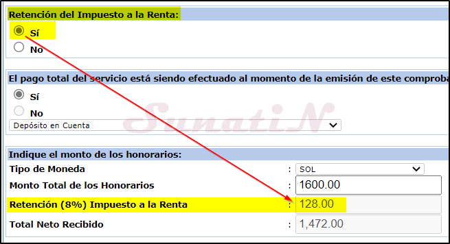 - «Retención del Impuesto a Renta»: Si la empresa te va a retener (descontar) el 8%; si el monto es menor o igual a S/ 1500 soles, podemos marcar «NO»; Si tenemos suspensión de retenciones – Form 1609 aprobado para el ejercicio actual, podemos marcar «NO» para cualquier monto. {SunatiN}