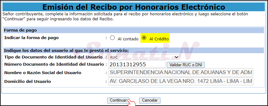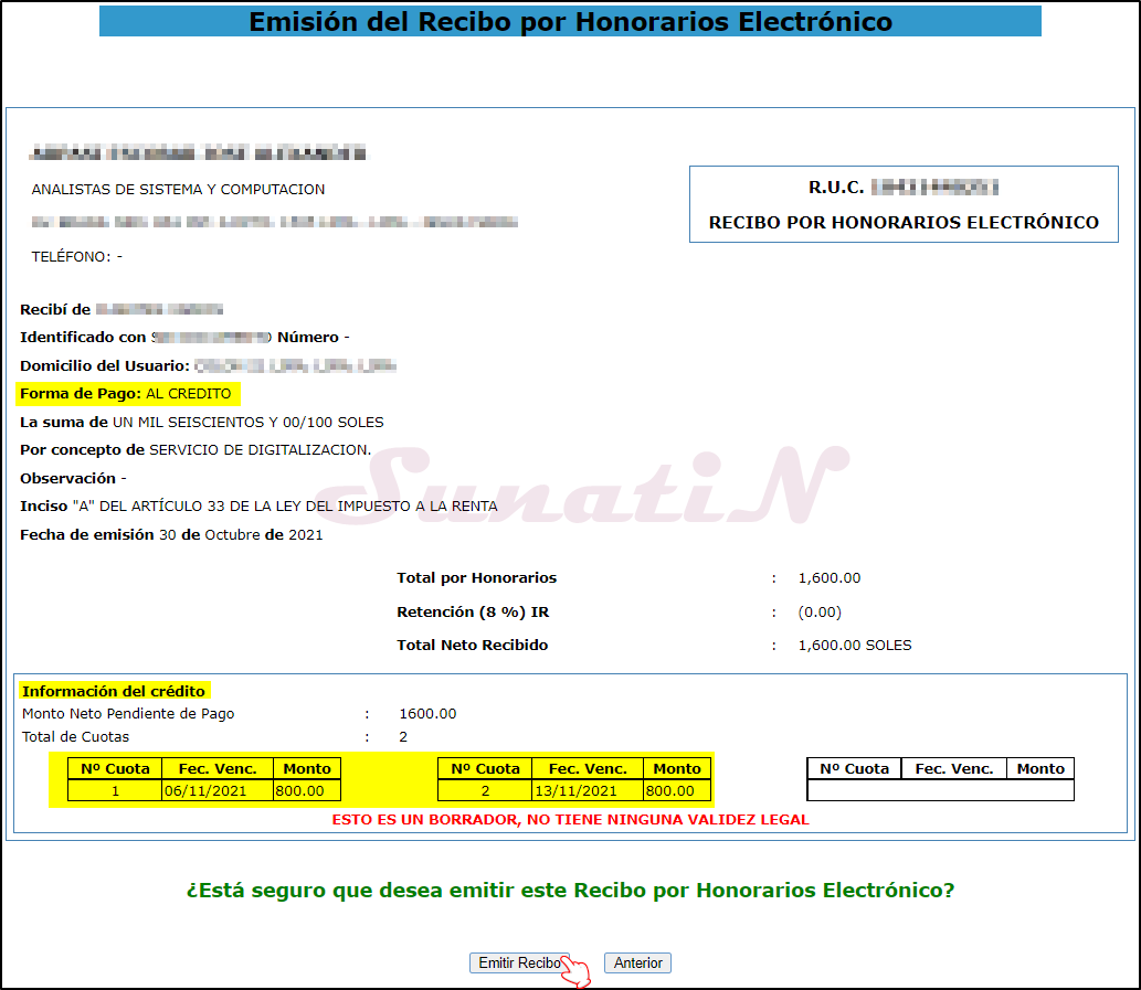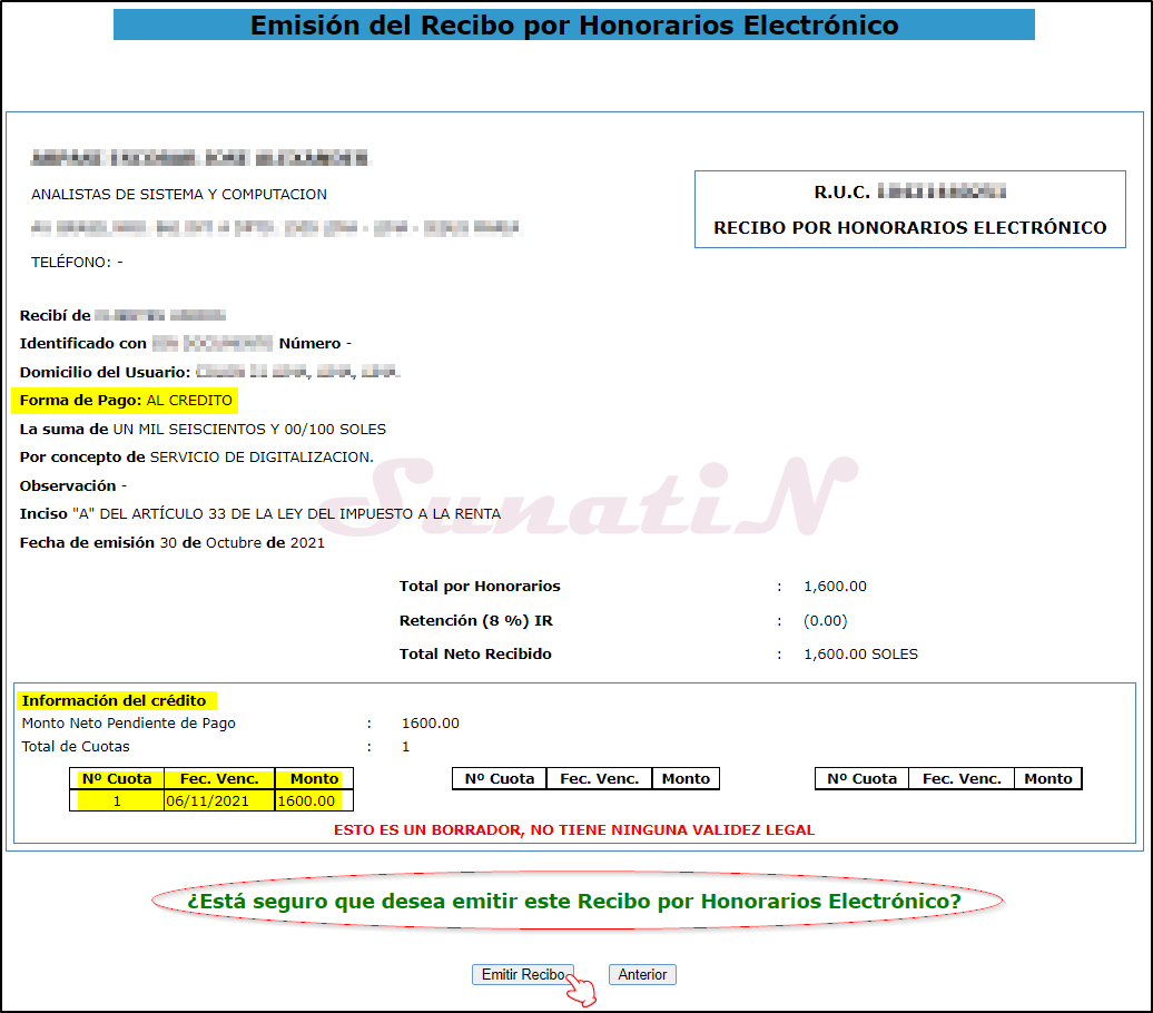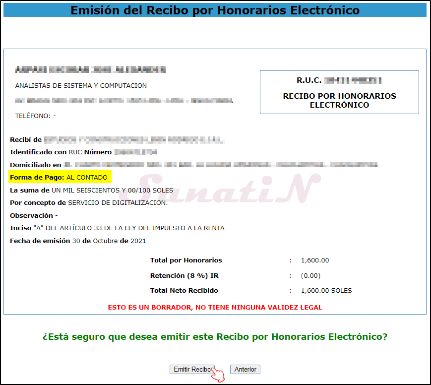- Si están todos los datos correctos daremos click en «EMITIR RECIBO». {SunatiN}