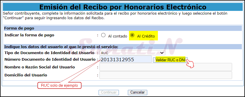 - Al validar RUC se activa el botón «Continuar».