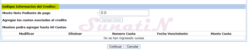 - «INFORMACIÓN DEL CRÉDITO»: sección nueva (desde Setiembre 2021), se debe «agregar» ó se debe ingresar al menos una cuota, dependiendo como se coordino con el empleador (quien pagara el servicio), ir a PASO 3 para agregar.