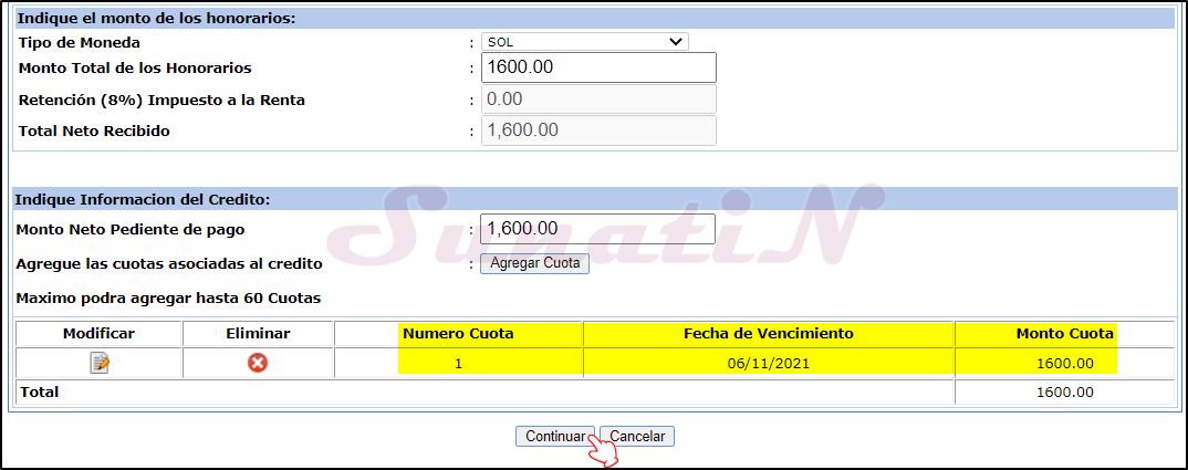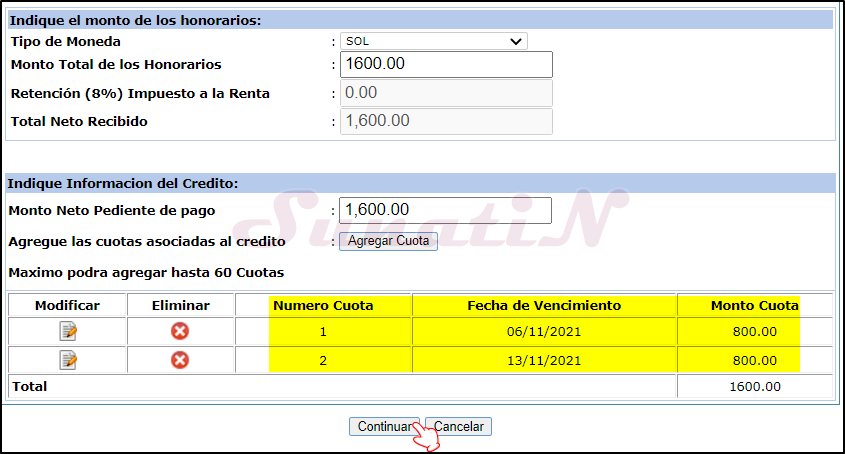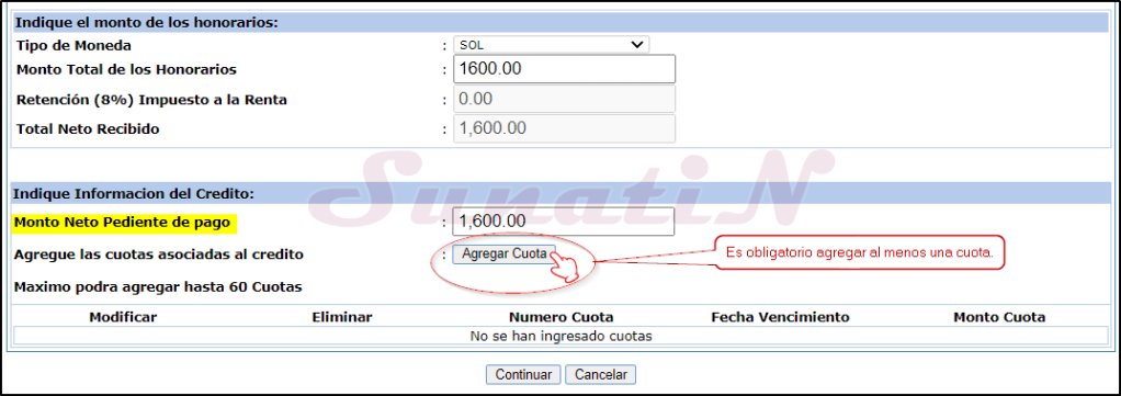 - SI EL CRÉDITO ES EN VARIAS CUOTAS (nos pagaran por partes), volvemos a hacer click en botón «Agregar Cuota», se puede agregar hasta 60 cuotas.